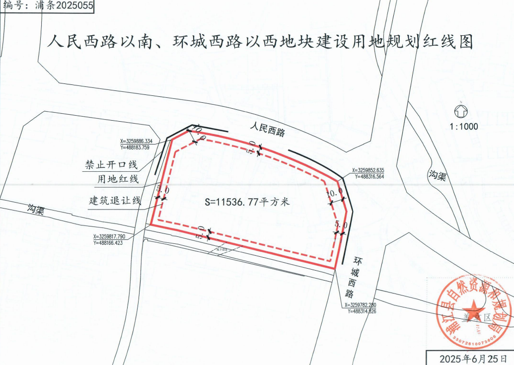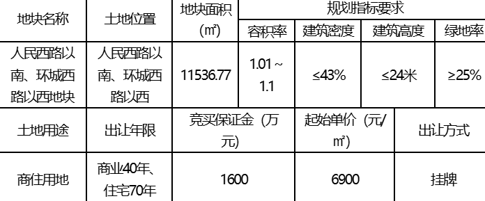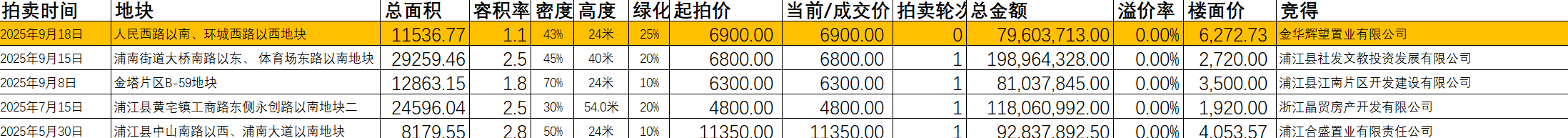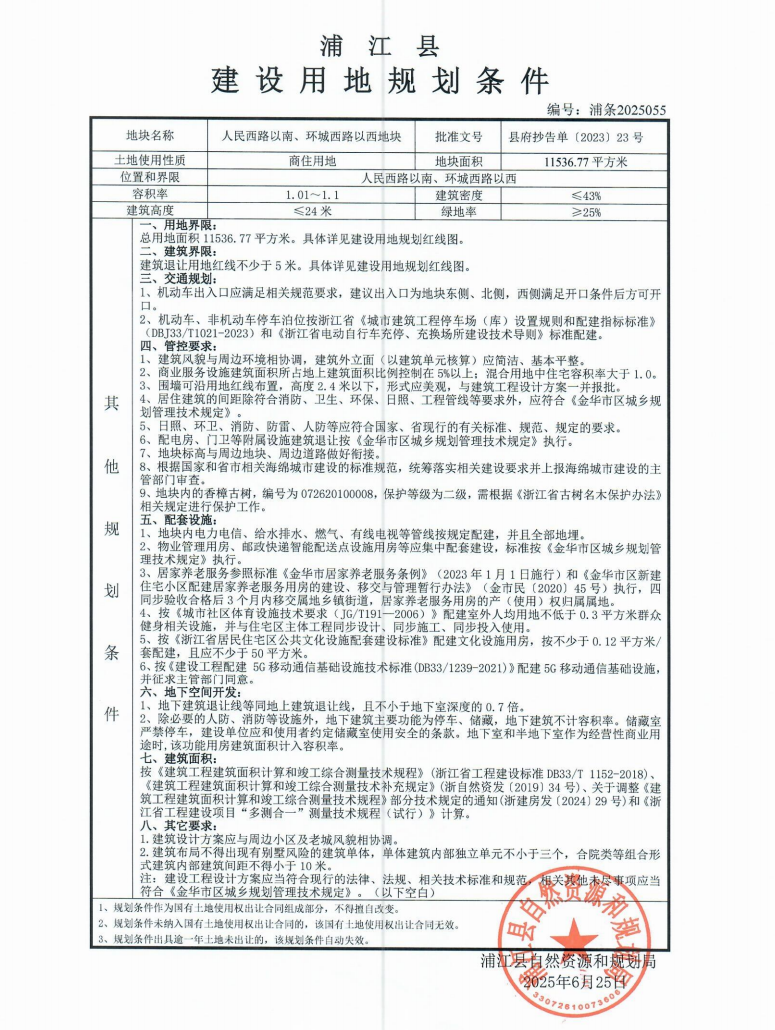 2025年9月18日,一宗名为“人民西路以南、环城西路以西地块”(普通商品住房用地)由金华辉望置业有限公司以底价拍得,成交单价6900元/㎡,总价7960万元,溢价率0%,楼面价6273元/㎡。地块出让面积11536.77平方米,规划容积率1.01-1.1,规划建筑密度≤43%,规划建筑高度≤24米,绿化率≥25%。