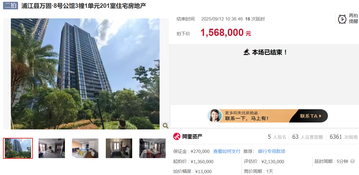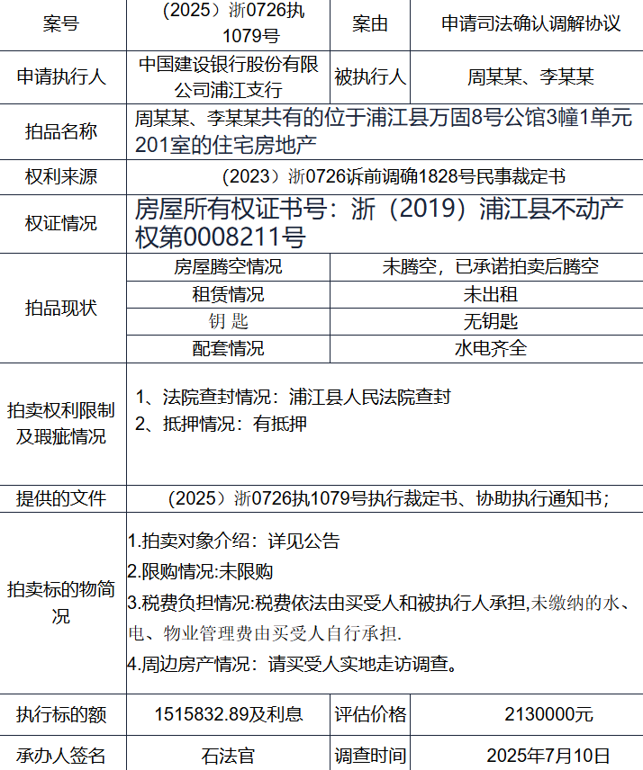 标的物为浦江县万固·8号公馆3幢1单元201室住宅房地产,房地产权利人为周某某、李某某,权证号为浙(2019)浦江县不动产权第0008211号,证载建筑面积为130.83平方米,土地使用权面积为6.27平方米,土地用途为城镇住宅用地,土地使用权类型为出让,土地使用权终止日期为2087年12月19日,登记日期为2019年08月23日。所在楼层第2层东边套,总层数共34层(含地下2层),层高约3米,建成时间2019年。