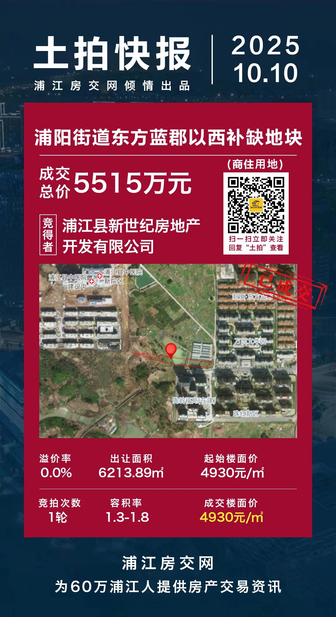 2025年10月10日,一宗名为“浦阳街道东方蓝郡以西补缺地块”(普通商品住房用地)由浦江县新世纪房地产开发有限公司(浦江县城市建设投资集团有限公司)底价拍得,成交单价8875元/㎡,总价约5515万元,溢价率0%,楼面价4930元/㎡。地块出让面积6213.89平方米,规划容积率1.3-1.8,规划建筑密度≤30%,规划建筑高度≤54米,绿化率≥30%。