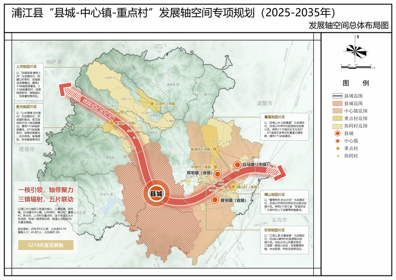 功能定位:规划以S219共富发展轴为引领,打造诗画浦江共同富裕示范样板为总体定位,建设成一条高新智造与现代农业发展轴、诗画浦江区域旅游精品线和城乡一体发展带。集聚高新智造、特色文旅、现代农业等特色产业,通过交通一体化、设施一体化和产业的深度融合,积极推动城乡一体化发展,实现城乡之间协调发展和共同繁荣。