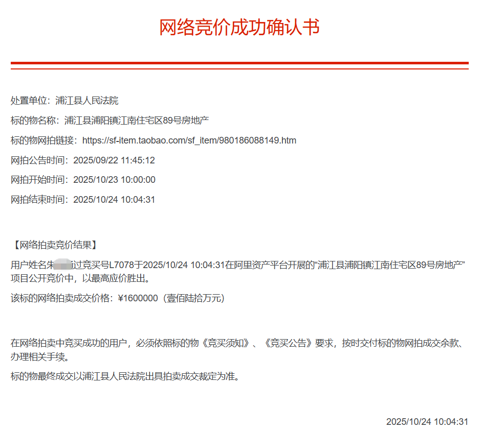 拍卖对象位于浦江县浦阳镇江南住宅区89号,房屋建筑面积226.8平方米,土地使用权面积93平方米,财产范围为拍卖对象的房屋所有权及土地使用权,含室内固定装修、房屋正常使用不可分割的共用设备设施及房屋所有权人合法享用的相关权益,不包括动产、债权债务、特许经营权等其他财产或权益。