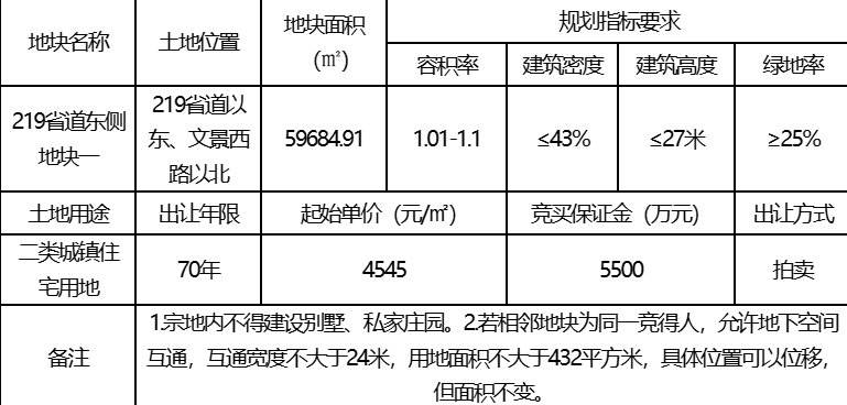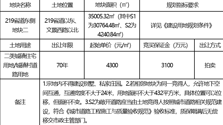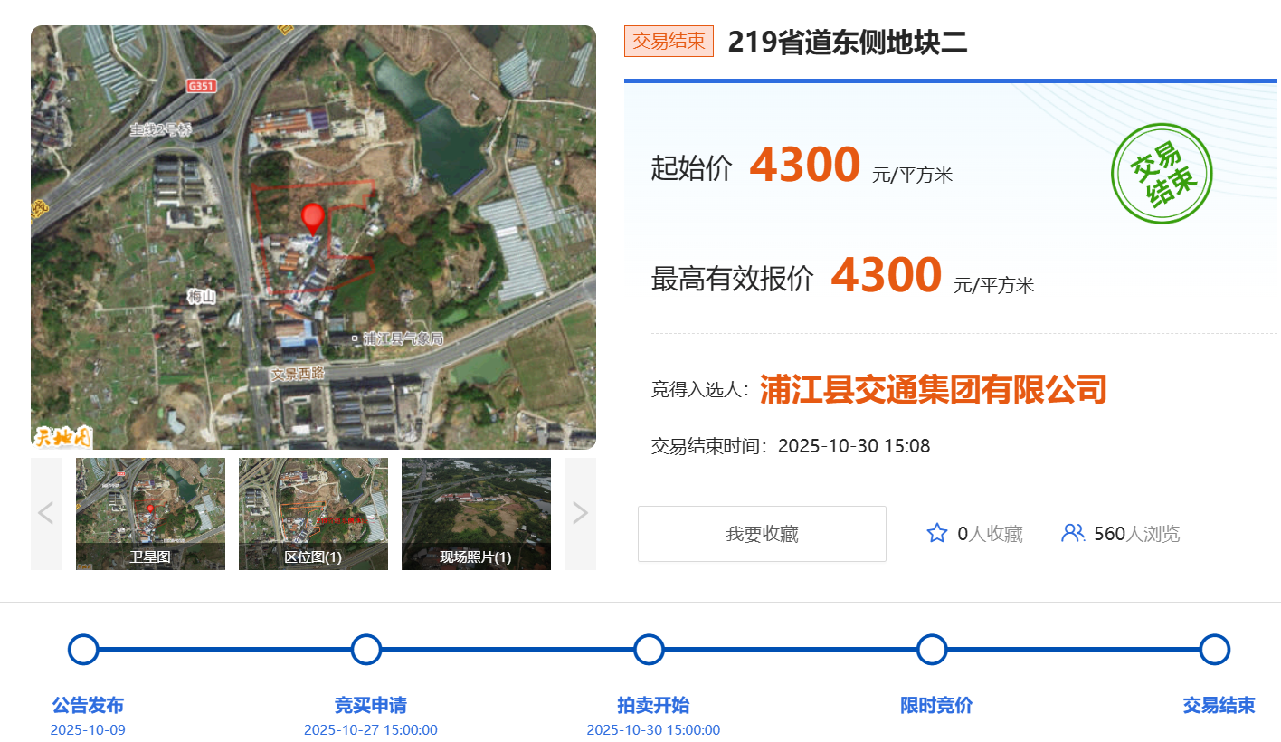 今天,浦江“219省道东侧地块一”、“219省道东侧地块二”,两地块成功拍卖结束!地块一位于219省道以东、文景西路以西,土地使用性质为普通商品住房用地(二类)。地块二位于219省道以东、文景西路以北,土地使用性质为普通商品住房用地(二类)/城镇村道路用地。出让年限均为70年。