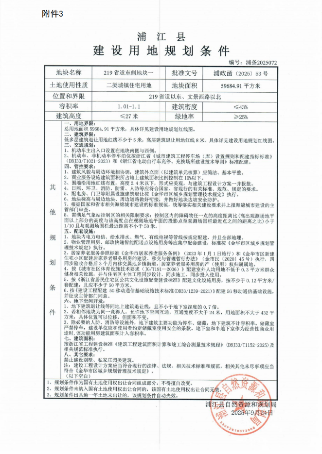 1轮出价,由浦江县交通集团有限公司以4545元/平方米的单价,约2.71亿元的总价拍得,溢价率0%,楼面价4132元/平方米。该地块出让面积59684.91㎡,规划容积率1.01-1.1,规划建筑密度≤43%,规划建筑高度≤27米,绿地率≥25%。