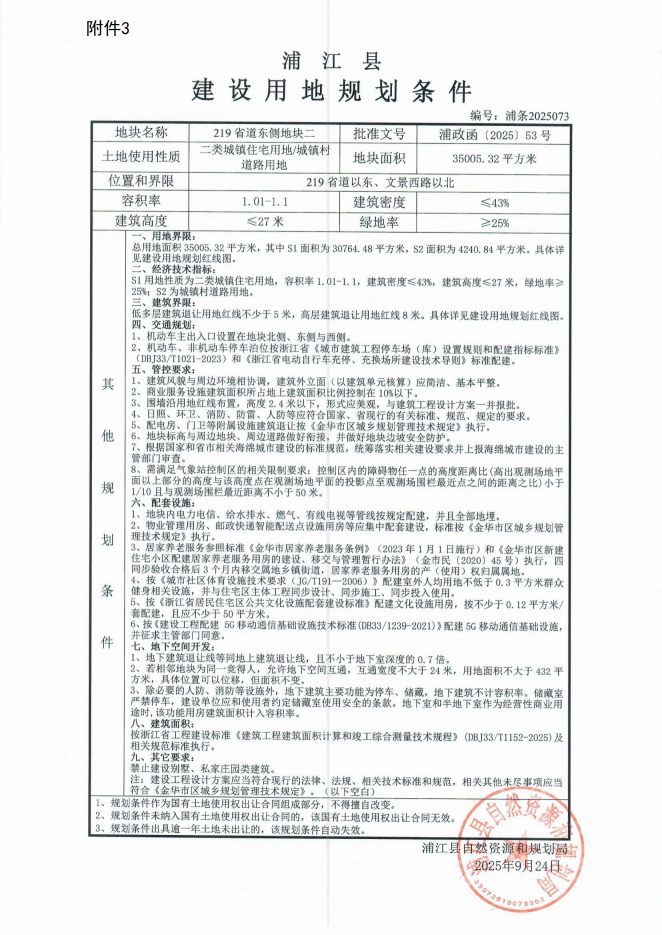 1轮出价,由浦江县交通集团有限公司以4300元/平方米的单价,约1.50亿元的总价拍得,溢价率0%,楼面价3909元/平方米。该地块出让面积35005.32㎡(其中S1面积为30764.48平方米住宅用地,S2面积为4240.84平方米道路用地),规划容积率1.01-1.1,规划建筑密度≤43%,规划建筑高度≤27米,绿地率≥25%。