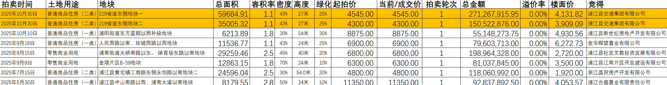 本年浦江土拍数据: