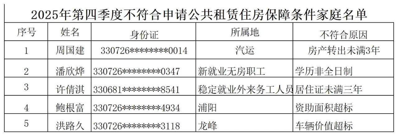 根据《浦江县公共租赁住房保障管理办法》和《浦江县公共租赁住房保障管理实施细则》等有关规定,经初审,对下列基本符合公共租赁保障资格和不符合公共租赁保障资格的人员予以公示,接受社会监督,公示期为7天。