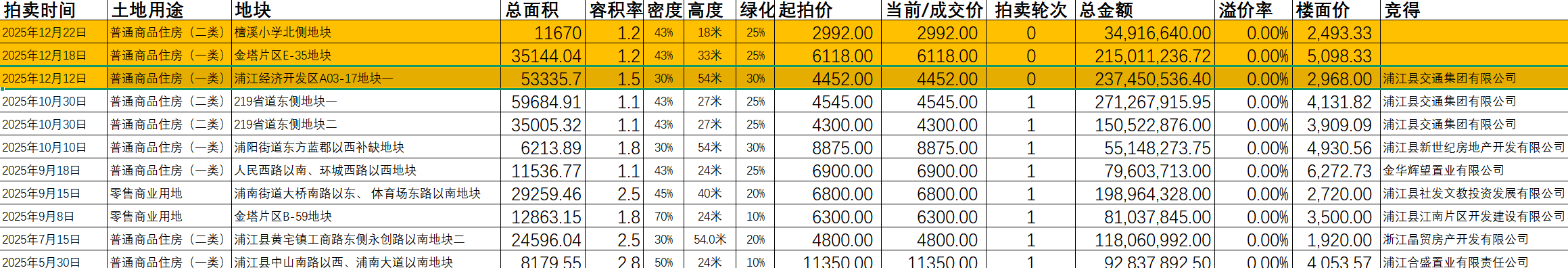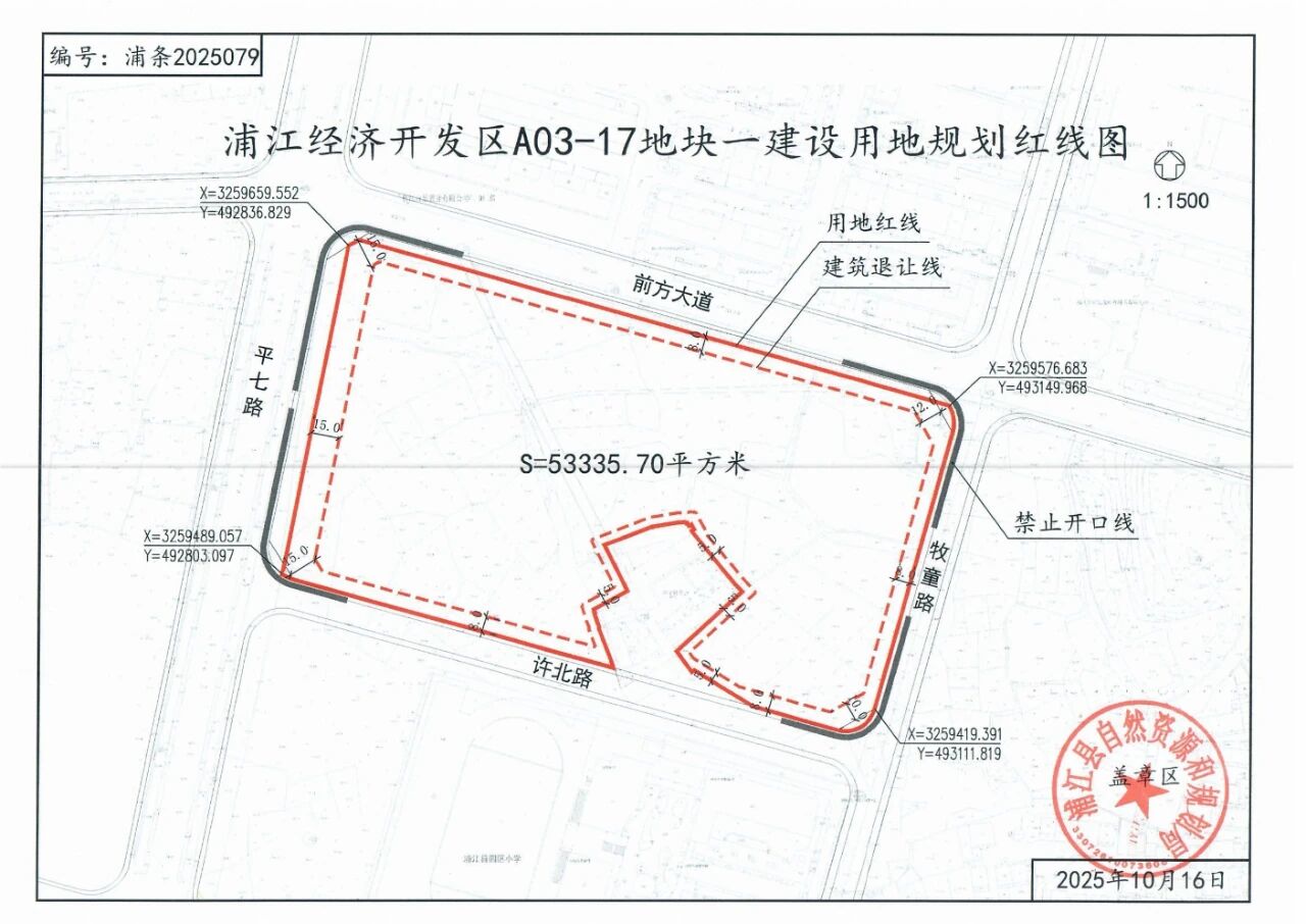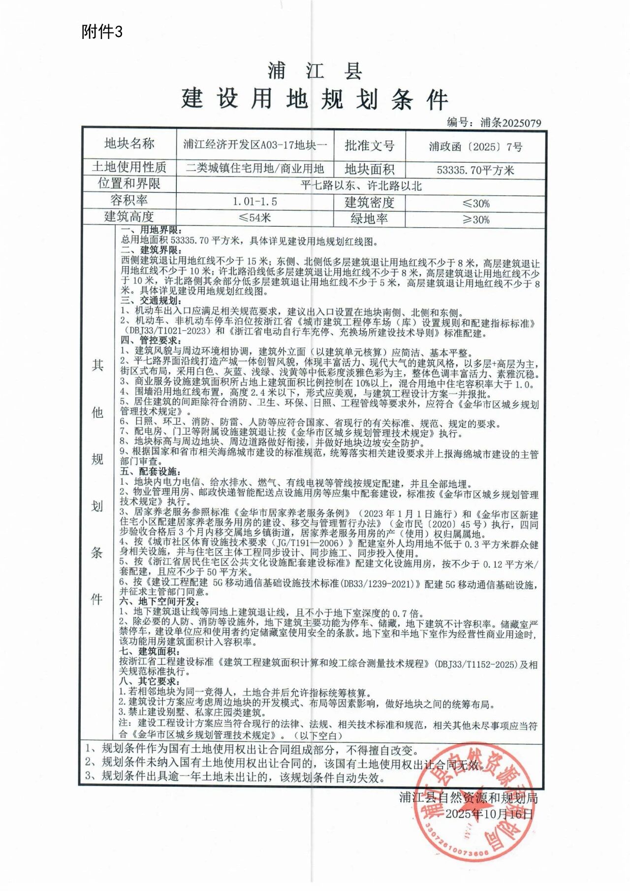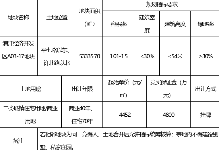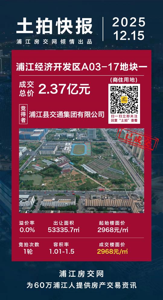 2025年10月15日,一宗名为“浦江经济开发区A03-17地块一”(普通商品住房用地)由浦江县交通集团有限公司底价拍得,成交单价4452元/㎡,总价约2.37亿元,溢价率0%,楼面价2968元/㎡。地块出让面积53335.7平方米,规划容积率1.01-1.5,规划建筑密度≤30%,规划建筑高度≤54米,绿化率≥30%。