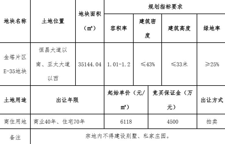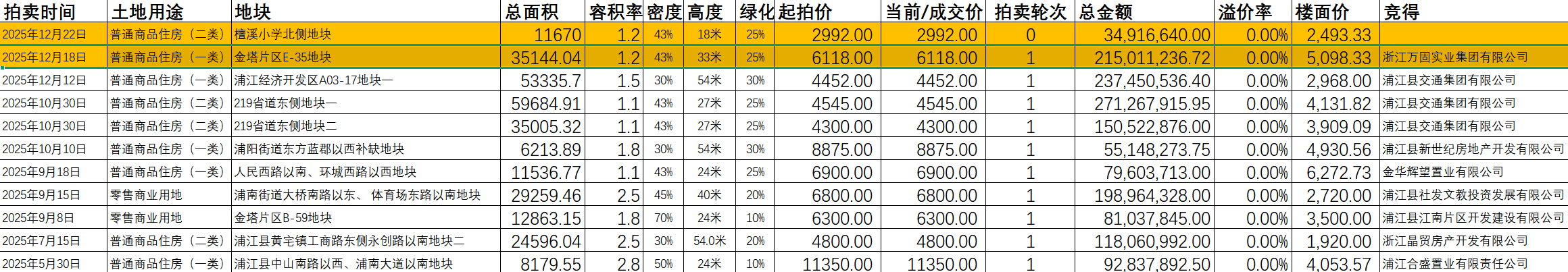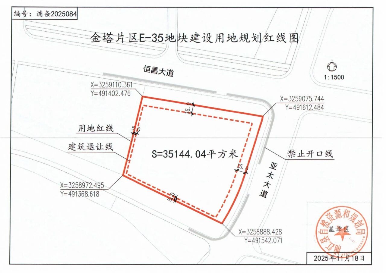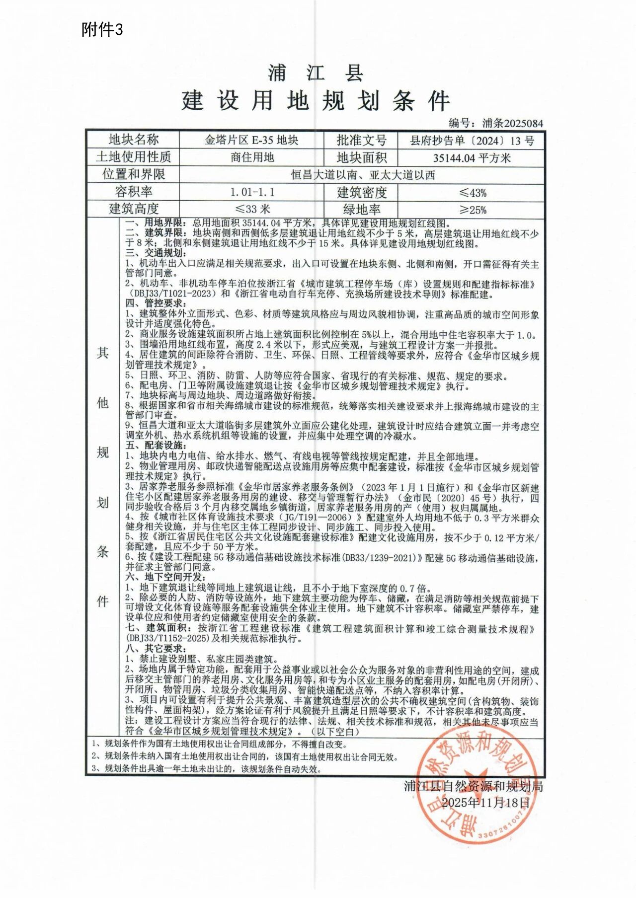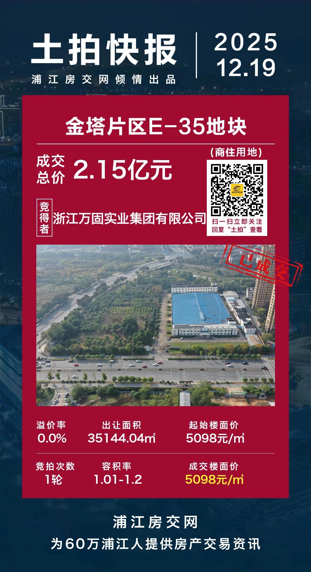 2025年12月19日,一宗名为“金塔片区E-35地块”(普通商品住房用地)由浙江万固实业集团有限公司底价拍得,成交单价6118元/㎡,总价约2.15亿元,溢价率0%,楼面价5098元/㎡。地块出让面积35144.04平方米,规划容积率1.01-1.2,规划建筑密度≤43%,规划建筑高度≤33米,绿化率≥25%。