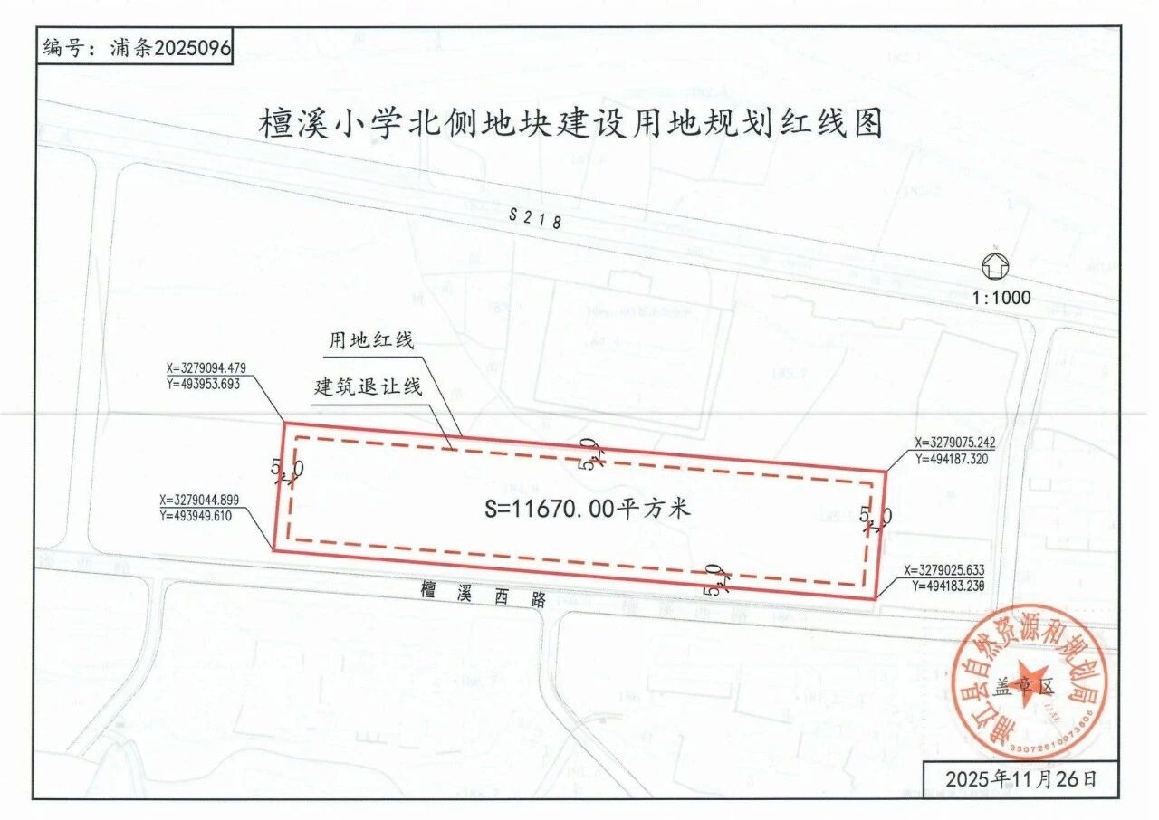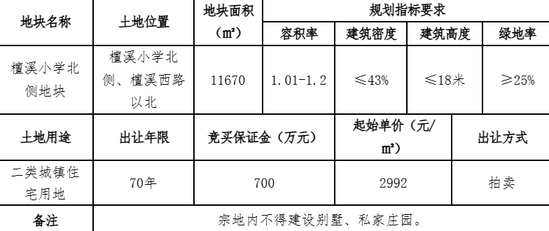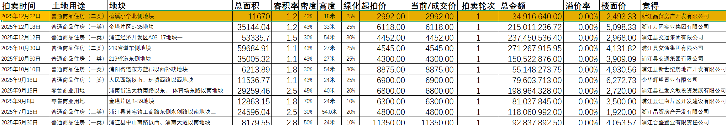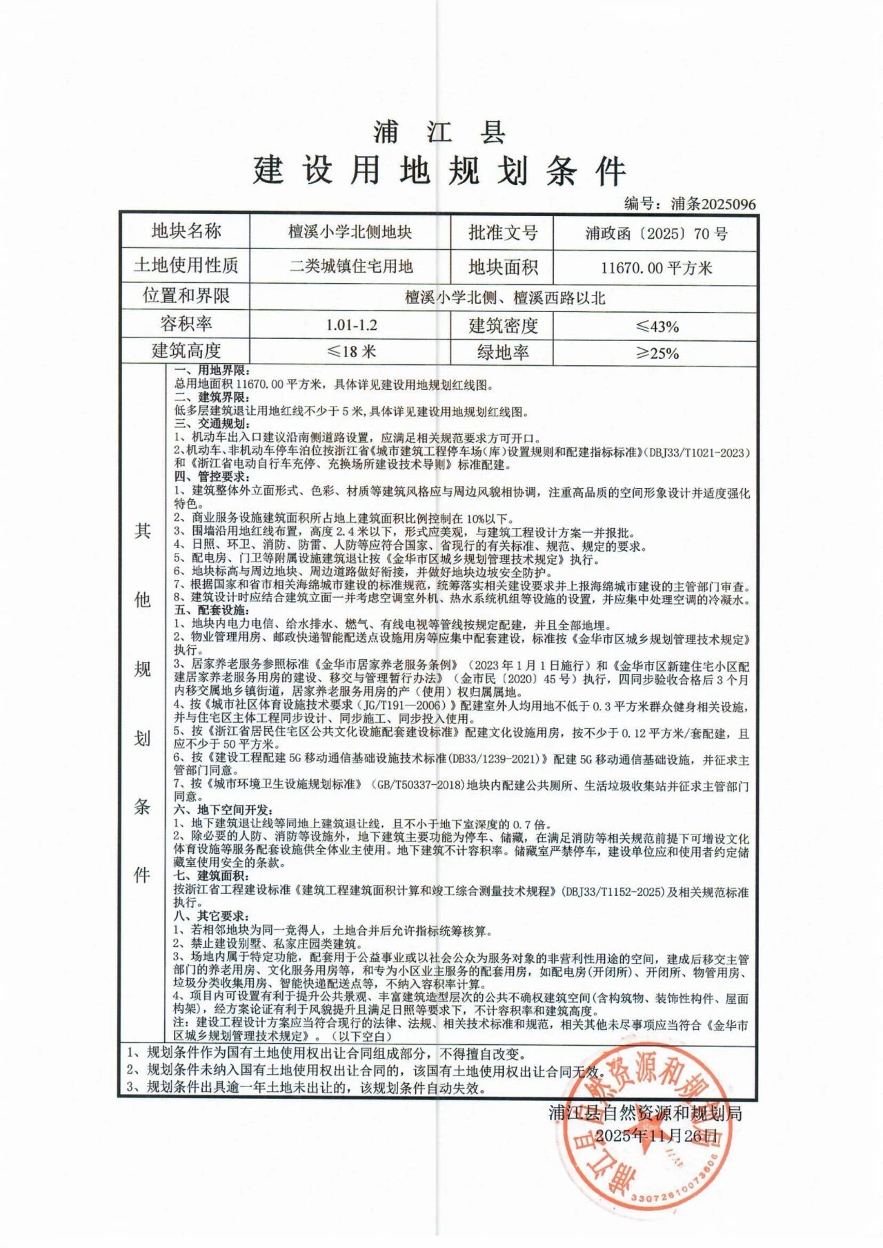 2025年12月23日,一宗名为“檀溪小学北侧地块”(普通商品住房用地)由浙江晶贸房产开发有限公司(浦江县浦创产业投资集团有限公司)底价拍得,成交单价2992元/㎡,总价约3492万元,溢价率0%,楼面价2493元/㎡。地块出让面积11670平方米,规划容积率1.01-1.2,规划建筑密度≤43%,规划建筑高度≤18米,绿化率≥25%。