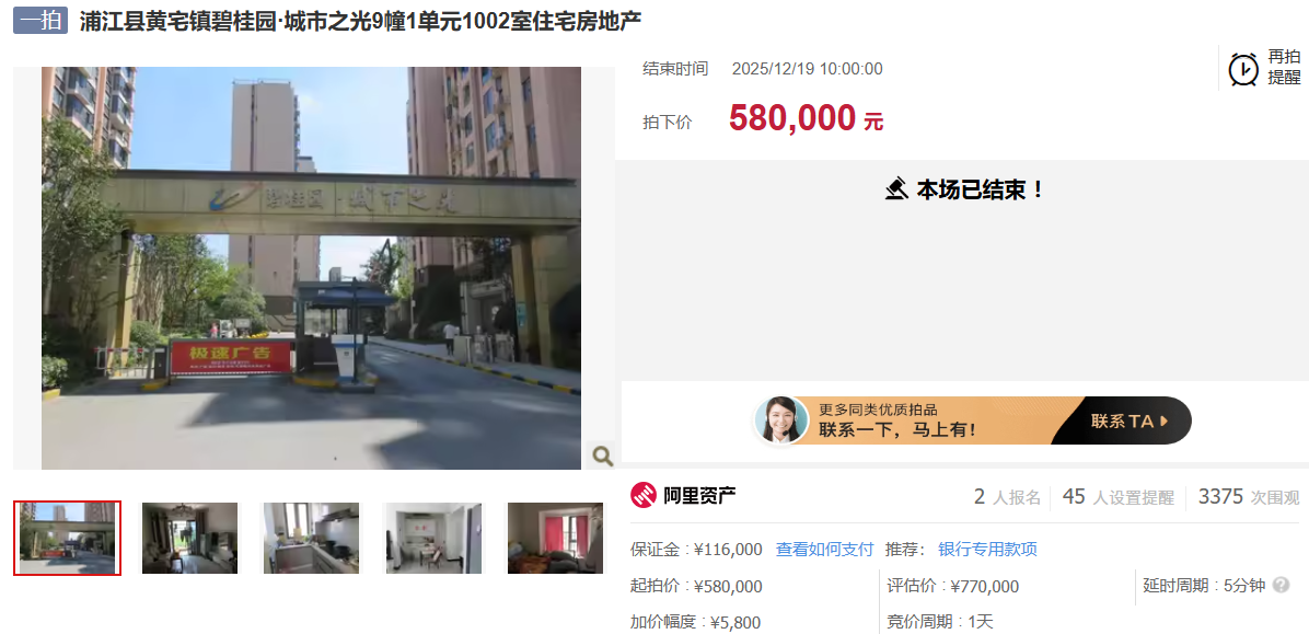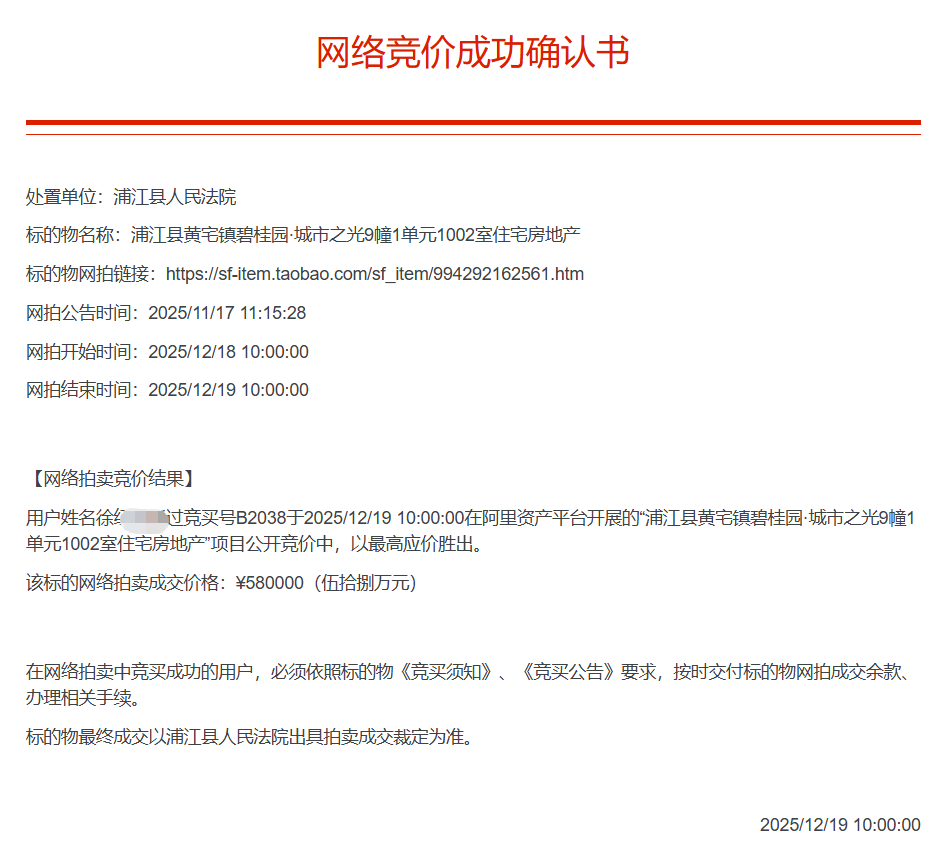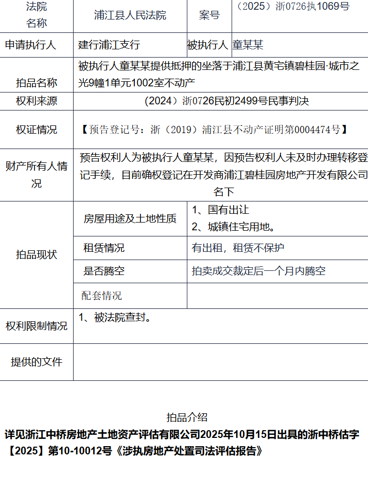系预告登记在童某某名下(因预告登记权利人未及时办理转移登记手续,目前确权登记在开发商浦江碧桂园房地产开发有限公司名下)坐落于浦江县黄宅镇碧桂园·城市之光9幢1单元1002室的住宅房地产,证载建筑面积87.48平方米,土地使用权面积11.00平方米,权证号为浙(2022)浦江县不动产权第0001459号,原预告登记证明号为浙(2019)浦江县不动产证明第0004140号,权利性质为出让/商品房,用途为城镇住宅用地/住宅,土地使用终止日期至2088年07月08日止,建筑年份约建于2021年,证载总层11层(地下1层地上10层),位于地上第10层,室内局部高约2.8米,证载为钢筋混凝土结构。