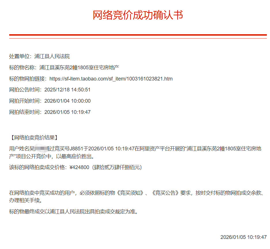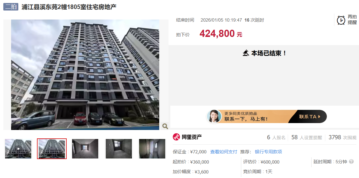 近日,坐落于浦江县溪东苑2幢1805室住宅房地产在淘宝阿里司法拍卖平台拍卖成功!这两套房子起拍价:36万元,建筑面积73.77平方米。经19轮竞价后,以42.48万元成交!单价约5758