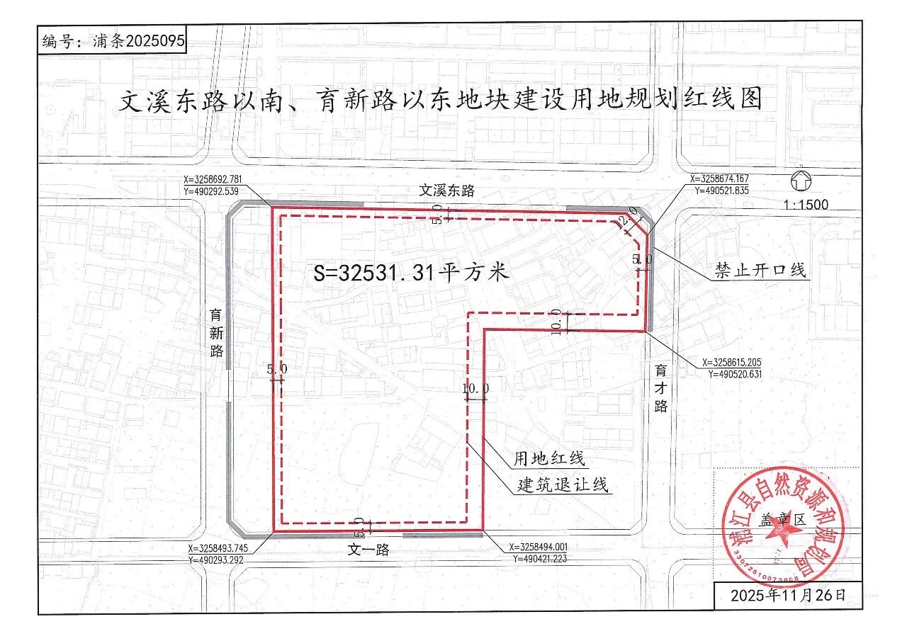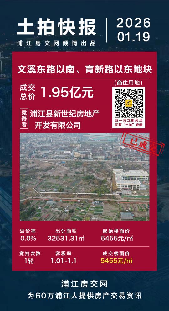 2026年1月16日,一宗名为“文溪东路以南、育新路以东地块”(普通商品住房用地二类)由浦江县新世纪房地产开发有限公司(浦江县城市建设投资集团有限公司)底价拍得,成交单价6000元/㎡,总价约1.95亿元,溢价率0%,楼面价5455元/㎡。地块出让面积32531.31平方米,规划容积率1.01-1.1,规划建筑密度≤43%,规划建筑高度≤33米,绿化率≥25%。