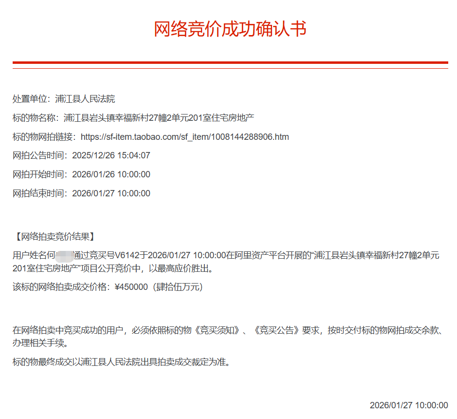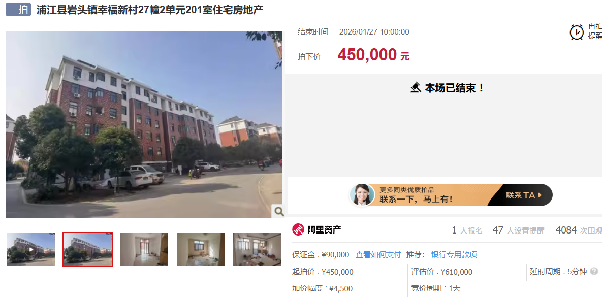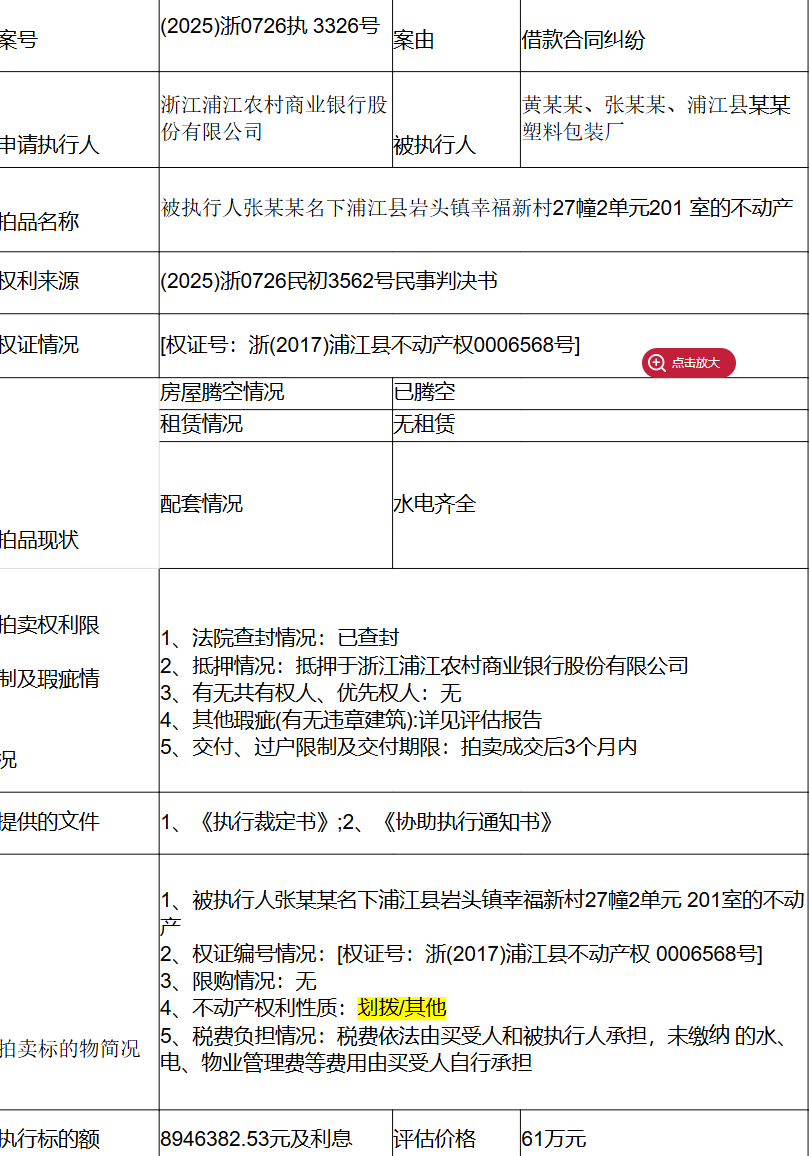 位于浦江县岩头镇幸福新村27幢2单元201室的房地产,房屋建筑面积129.86平方米,土地使用权面积23.27平方米,用途为城镇住宅用地/住宅,权利性质为划拨/其它,权利类型为国有建设用地使用权/房屋所有权,权证号(证明号):浙(2017)浦江县不动产权第0006568号,建筑结构为混合结构,楼层共5层,所在第2层中间套,层高约3米,建成时间2014年,登记日期2017年10月13日。