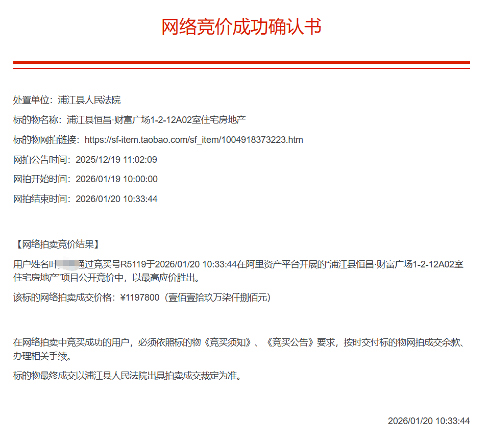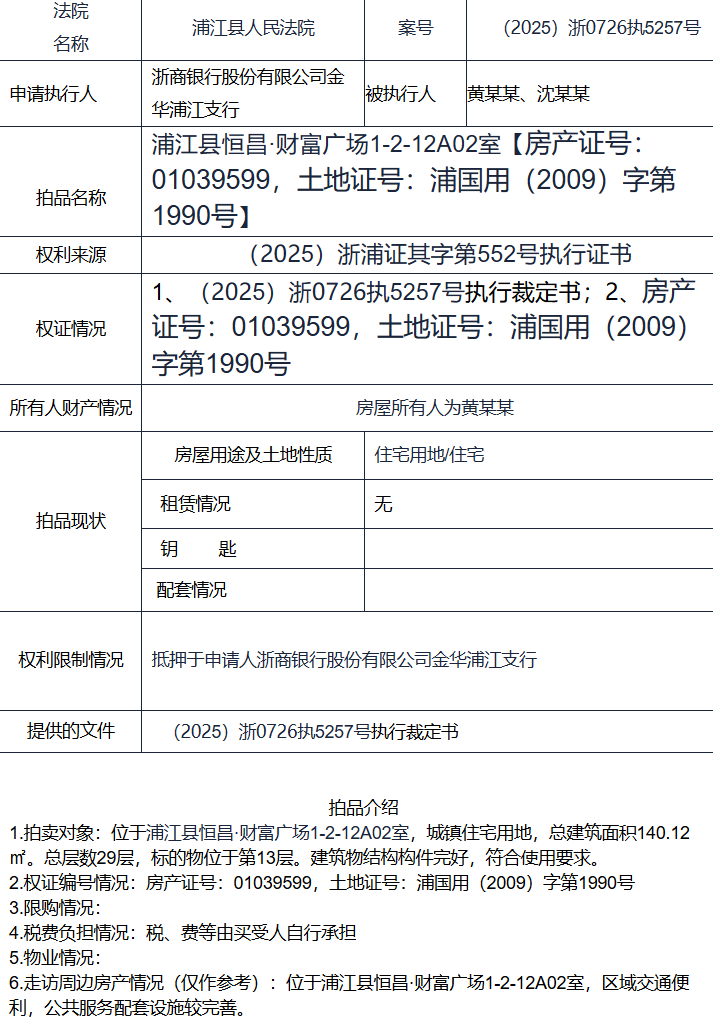 位于浦江县恒昌·财富广场1-2-12A02室,房屋证载建筑面积140.12平方米,房屋所有权证号01039599,土地使用权面积20.83平方米,国有土地使用权证号为浦国用(2009)字第1990号,土地使用权人黄某某,用途为城镇住宅用地,使用权类型为出让,终止日期2075年1月22日,房屋总层数29层,所在层13层,钢筋混凝土结构,建成年份2008年。
