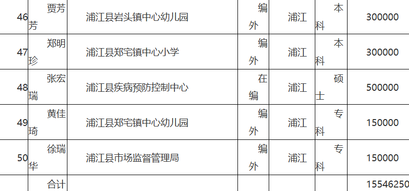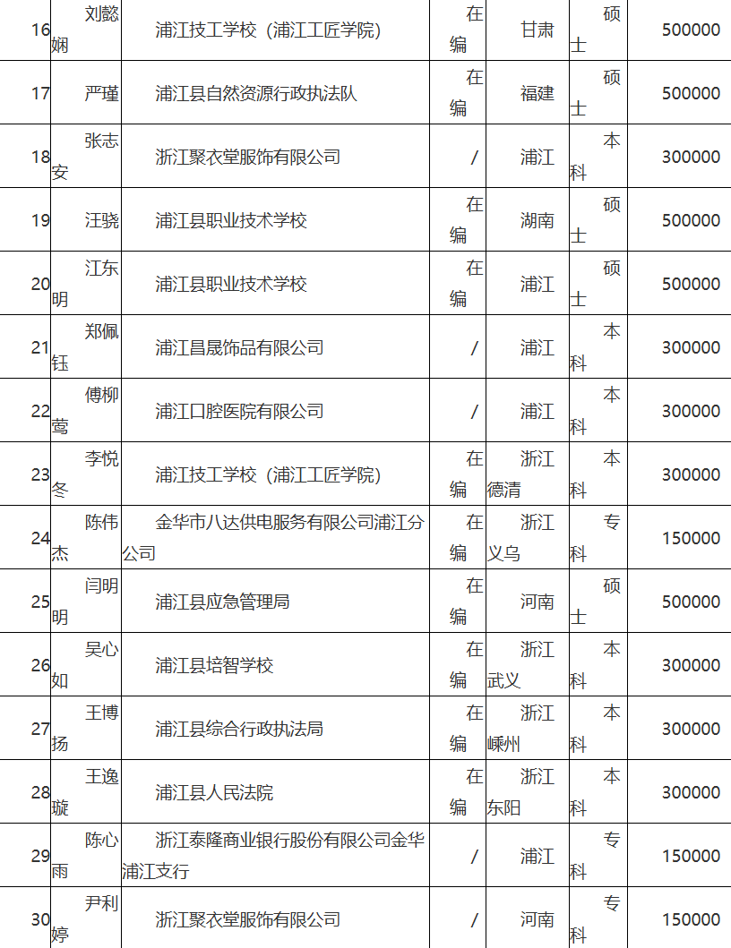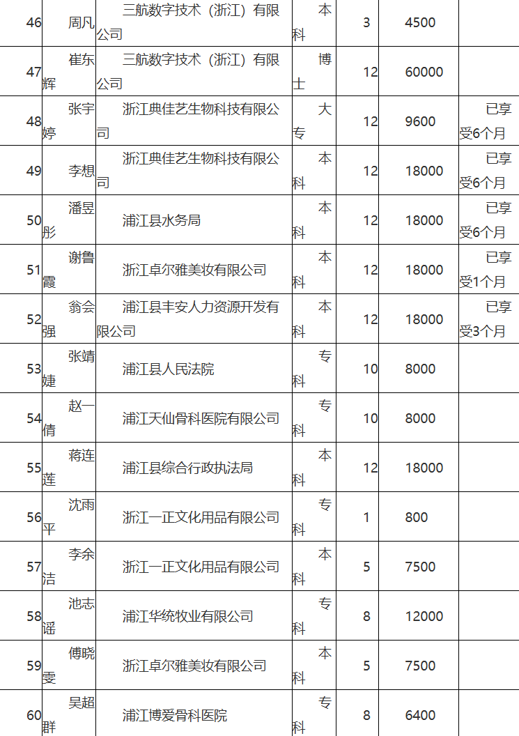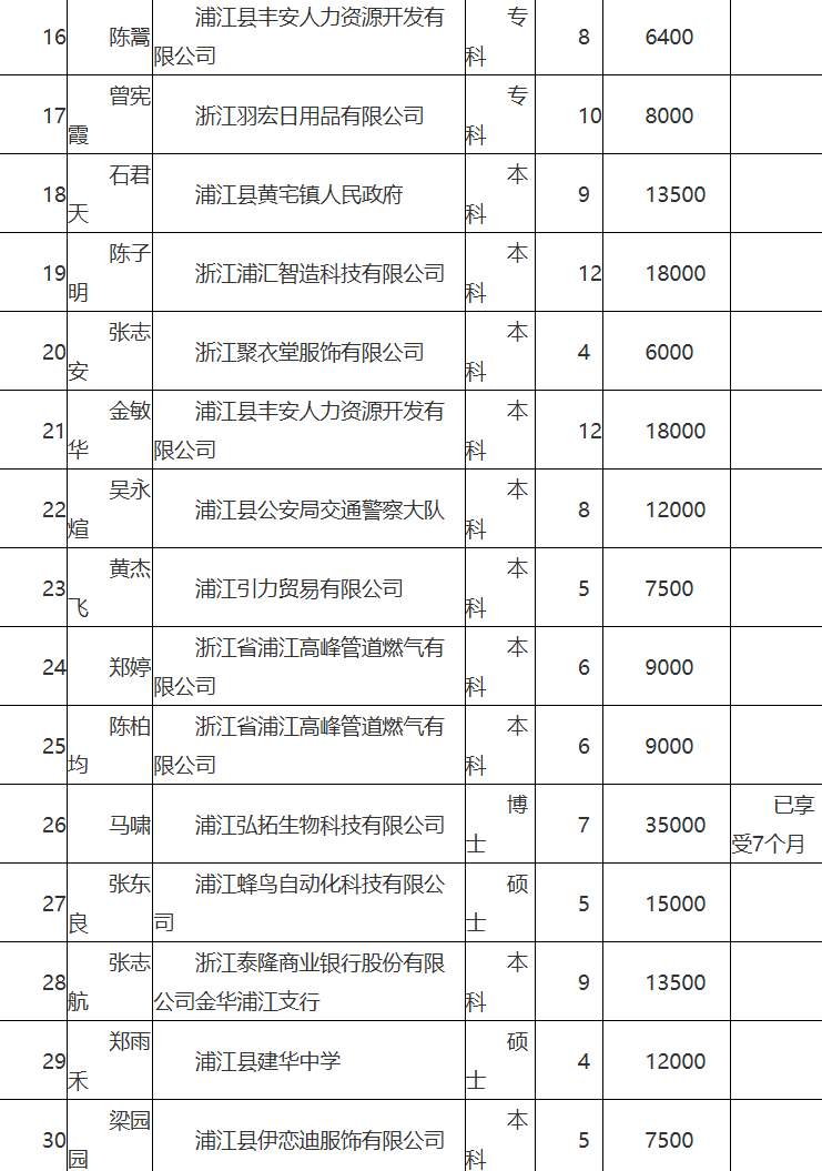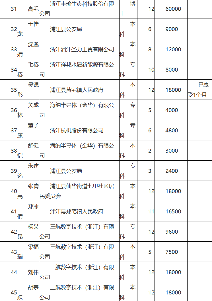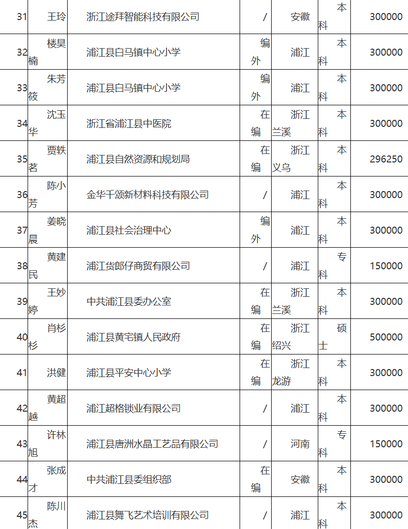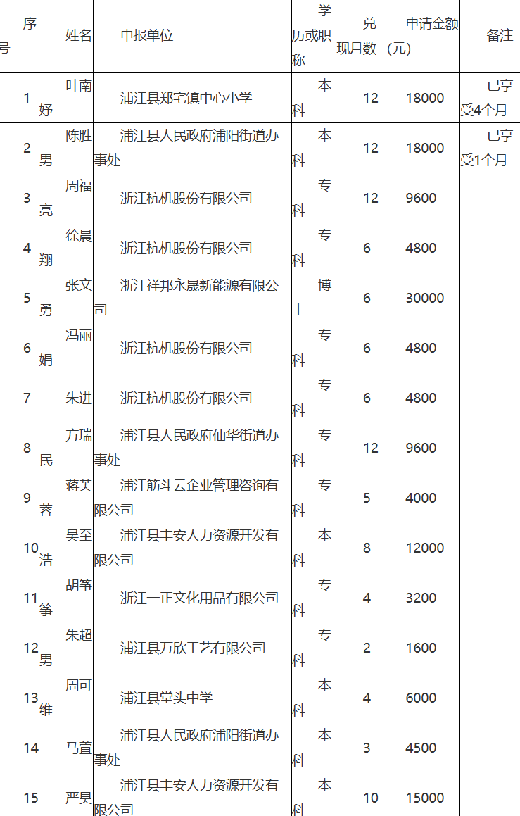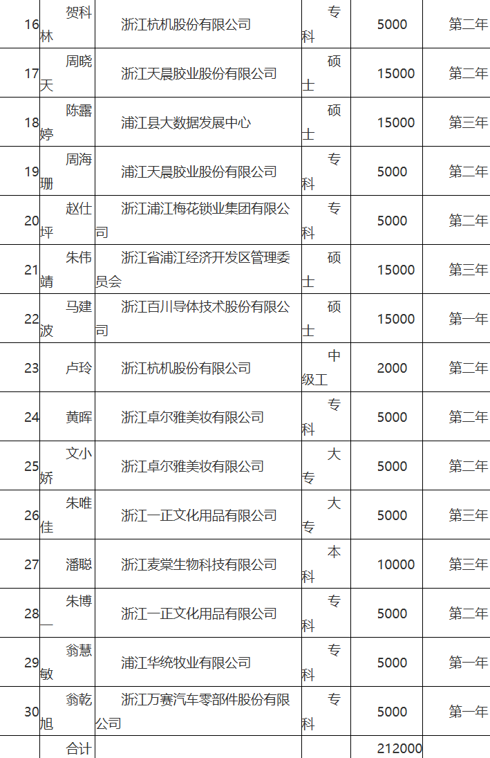 为进一步贯彻落实县委"五大战略",大力开展人才科技攻坚行动,全方位培育、引进、用好人才,根据《关于支持人才创业创新促进“繁荣浦江”建设的若干意见》(浦委发〔2017〕37号)、《关于实施“才聚浦江”行动打造创业创新高地的意见》(浦人才〔2022〕1号)文件精神,经自主申报、科室审核、部门联审,现将拟享受人才政策补助的人员予以公示(名单附后)。公示期从2026年1月28日起到2月3日止。单位和个人对公示对象享受人才政策补助方面存在的问题,均可以通过来信、来电、来访等形式反映。单位反映问题的,须盖公章;个人反映问题的,提倡署本人真实姓名。反映问题要坚持实事求是的原则。