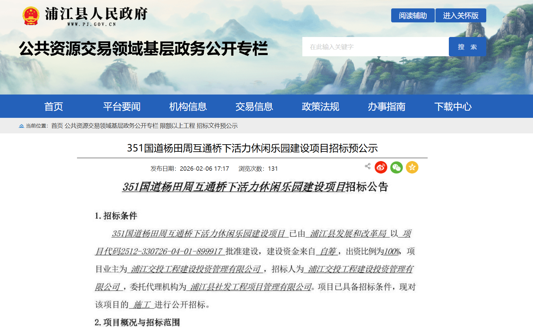 近日,浦江县人民政府网发布“351国道杨田周互通桥下活力休闲乐园建设项目招标预”公示,标志着该民生项目正式进入招标筹备阶段。