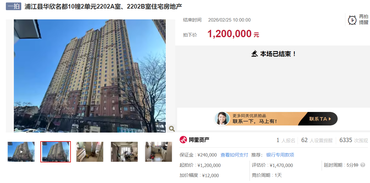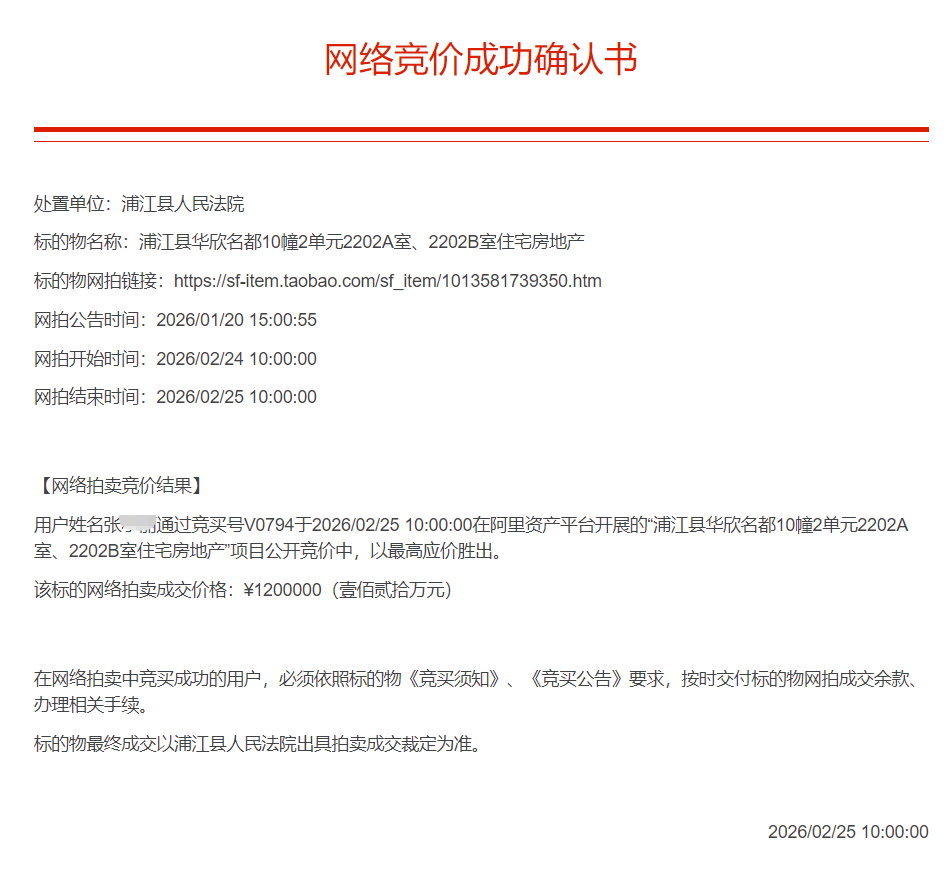 位于浦江县华欣名都10幢2单元2202A室、2202B室,房屋建筑面积合计137.64平方米,土地使用权面积合计5.34平方米,其中华欣名都10幢2单元2202A室国有土地使用权证号为浦国用(2015)第2138号,房屋所有权证号01064326-2、01064326-1;华欣名都10幢2单元2202B室国有土地使用权证号为浦国用(2015)第2137号,房屋所有权证号01064325-2、01064325-1,土地使用期限至2079年1月15日,用途为城镇住宅用地,建筑用途为住宅,使用权类型为出让,房屋总楼层数31层,所在层22层,建成年份为2013年,建筑物结构为钢筋混凝土结构。空间布局:2202A室和2202B室合并为一个套房,户型为三室二厅一厨二卫。装饰装修:入户为防盗门,客餐厅地砖地面,墙砖墙面,石膏板吊顶,装饰背景墙,带固定柜;房间木地板地面,墙纸墙面,天棚涂料,带固定柜;厨房地砖地面,墙砖墙面,集成吊顶,带橱柜、吊柜;卫生间地砖地面,墙砖墙面,集成吊顶,带洗漱台、淋浴房、马桶等卫生洁具;断桥铝窗,木门、合金玻璃门等。房屋装饰装修描述与现状不完全一致的或其他未述及部分,以现状实物为准。特别提醒:经评估人员向小区物业公司了解,未缴纳自2022年7月1日至2026年6月30日物业管理费11892元(仅供参考)。上述物业费欠缴情况仅供参考,具体数额请自行咨询相关单位或公司。